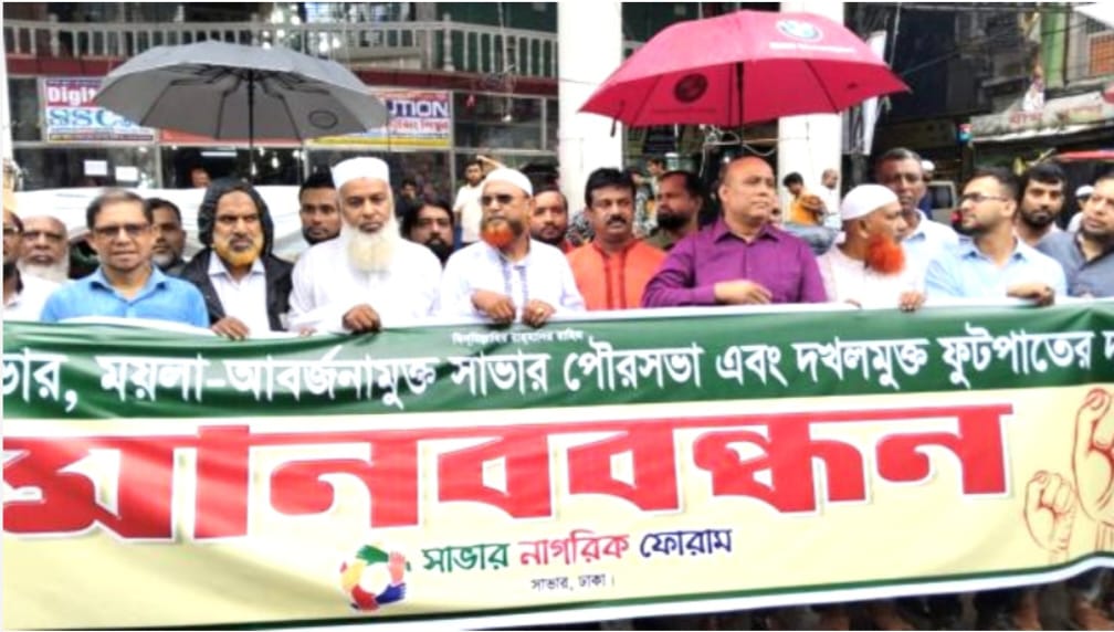 সাভারে নাগরিক ফোরামের উদ্যোগে যানজট, ফুটপাত দখল ও ময়লা-আবর্জনামুক্ত দাবিতে মানববন্ধন কর্মসূচি পালন করেছে।